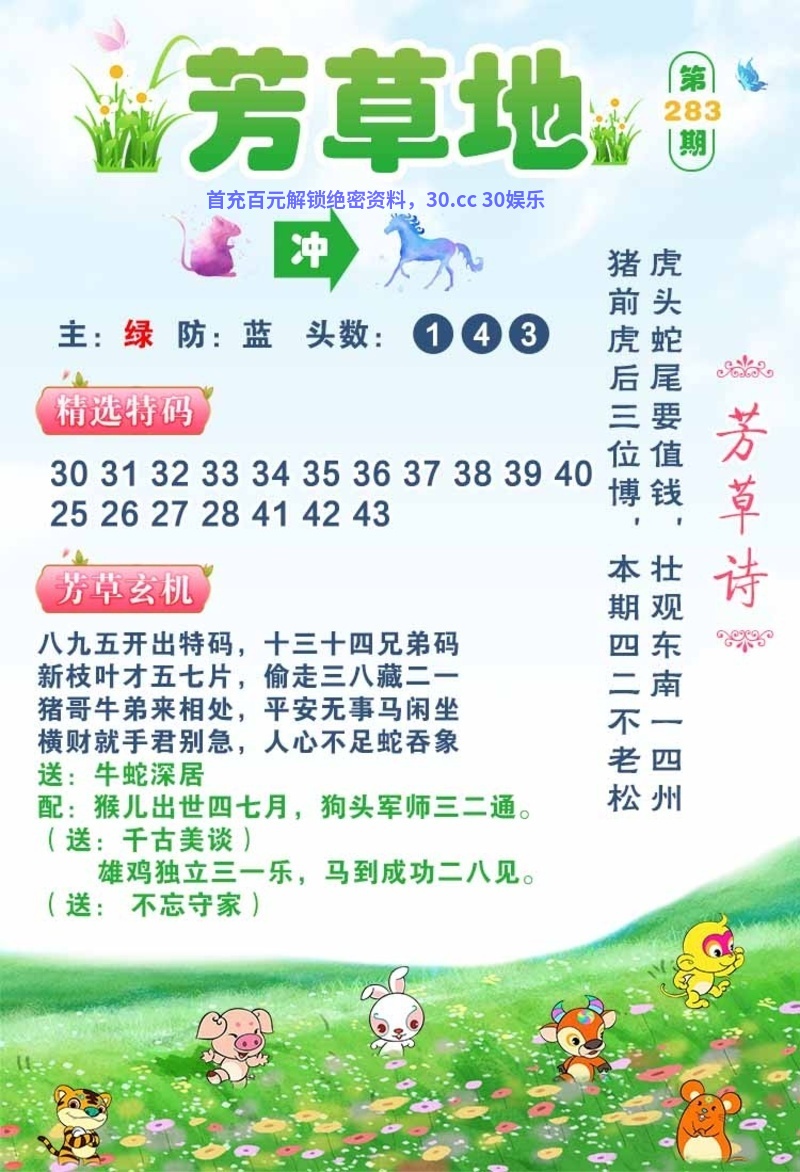 283期芳草玄机八九五开出特码,十三十四兄弟码。新枝叶才五七片,偷走三八藏二一。猪哥牛弟来相处,平安无事马闲坐。横财就手君别急,人心不足蛇吞象。