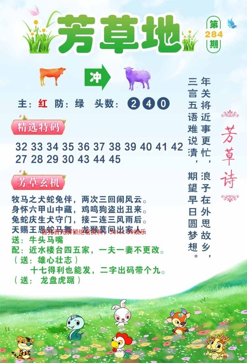 285期芳草玄机满面春风一洒脱,二二四里好三奇。三五本期相见面,奋发图强报国恩。接二连三吼十五,五门必有四七出。大有大码开三八,小得小利六九来。